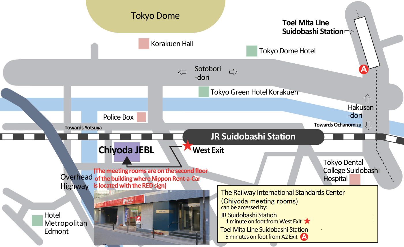 The Railway International Standards Center is in the building called Chiyoda JEBL. The following figure shows the direction from Suidobashi Station to the Chiyoda JEBL.